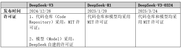 至2024年3月发布的DeepSeek-V3-0324模型,DeepSeek正式将该模型内包括模型权重在内的全部组件统一采用MIT协议[20]。此举不仅表明 DeepSeek 向国际通行的开源实践靠拢,更折射出其在全球大模型竞争背景下,力求通过降低生态门槛以扩大社区影响力与实际落地场景的战略考量。