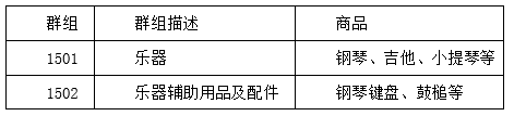 例如第15类乐器(第一层),包含两个群组1501和1502(第二层),而每个群组中又包含不同的商品服务项目(第三层)(见表1)。